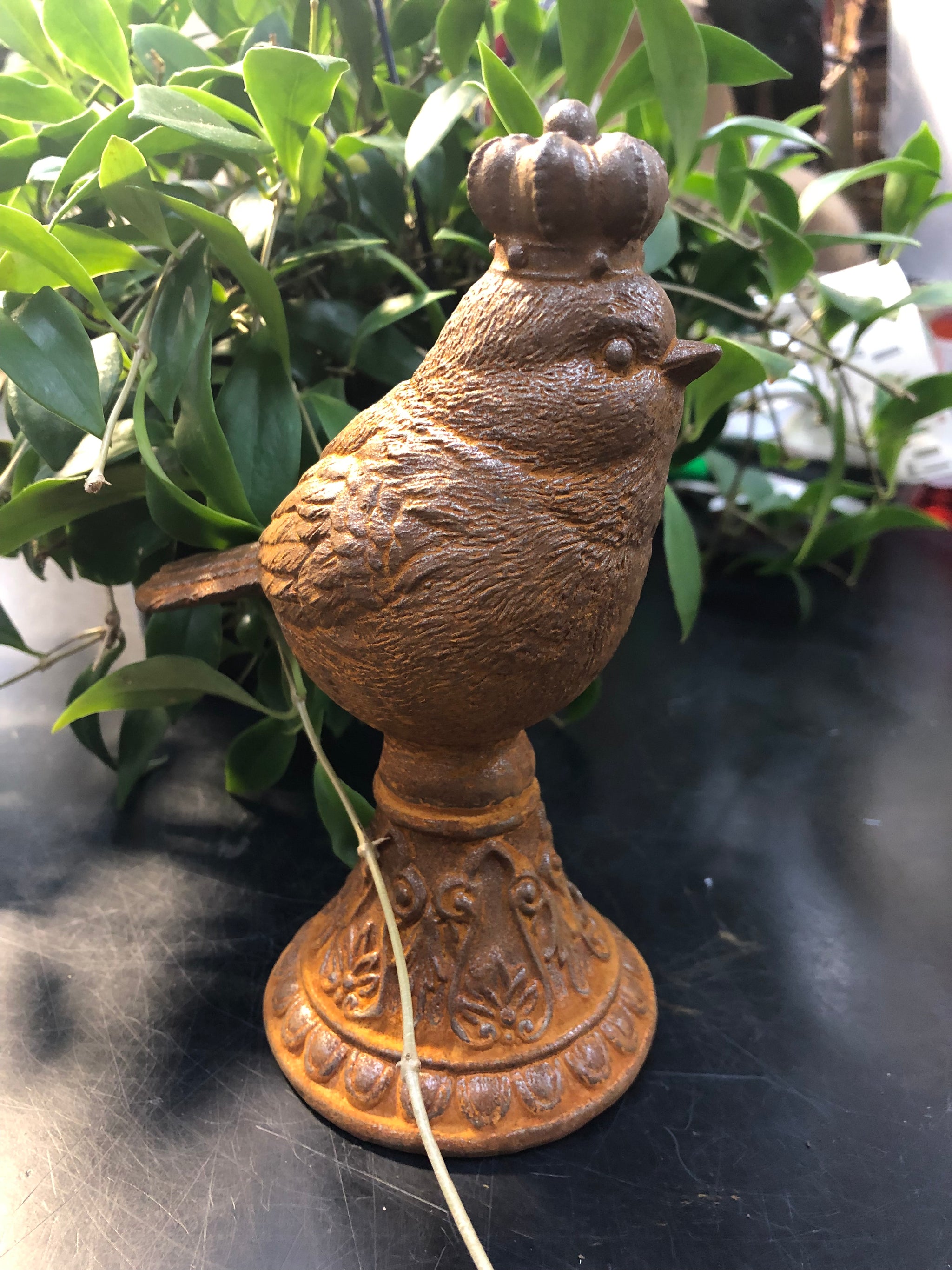 A quirky and cute  Queen Sparrow and King Sparrow with a crown. A delightful paper weight or garden ornament. ( cast iron )