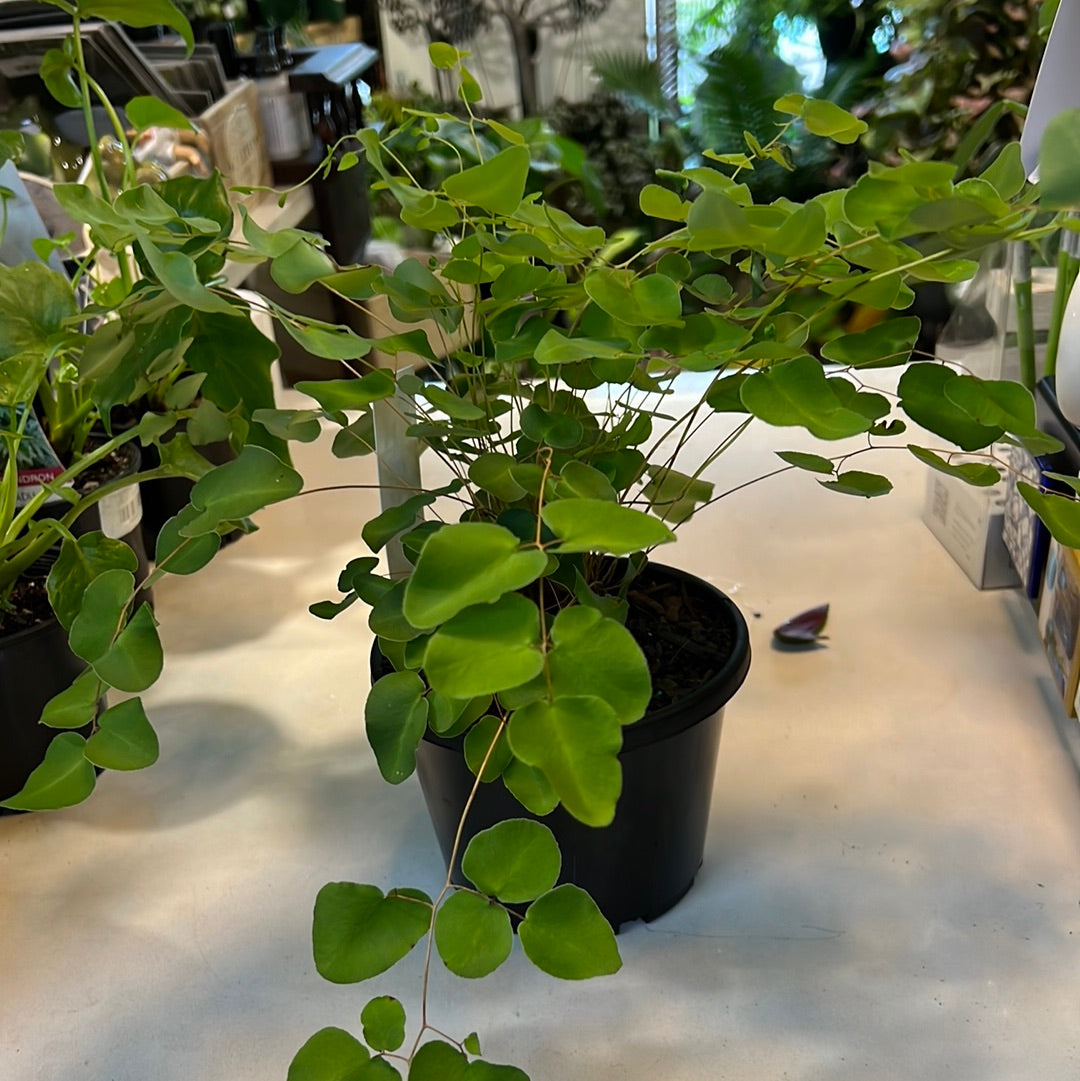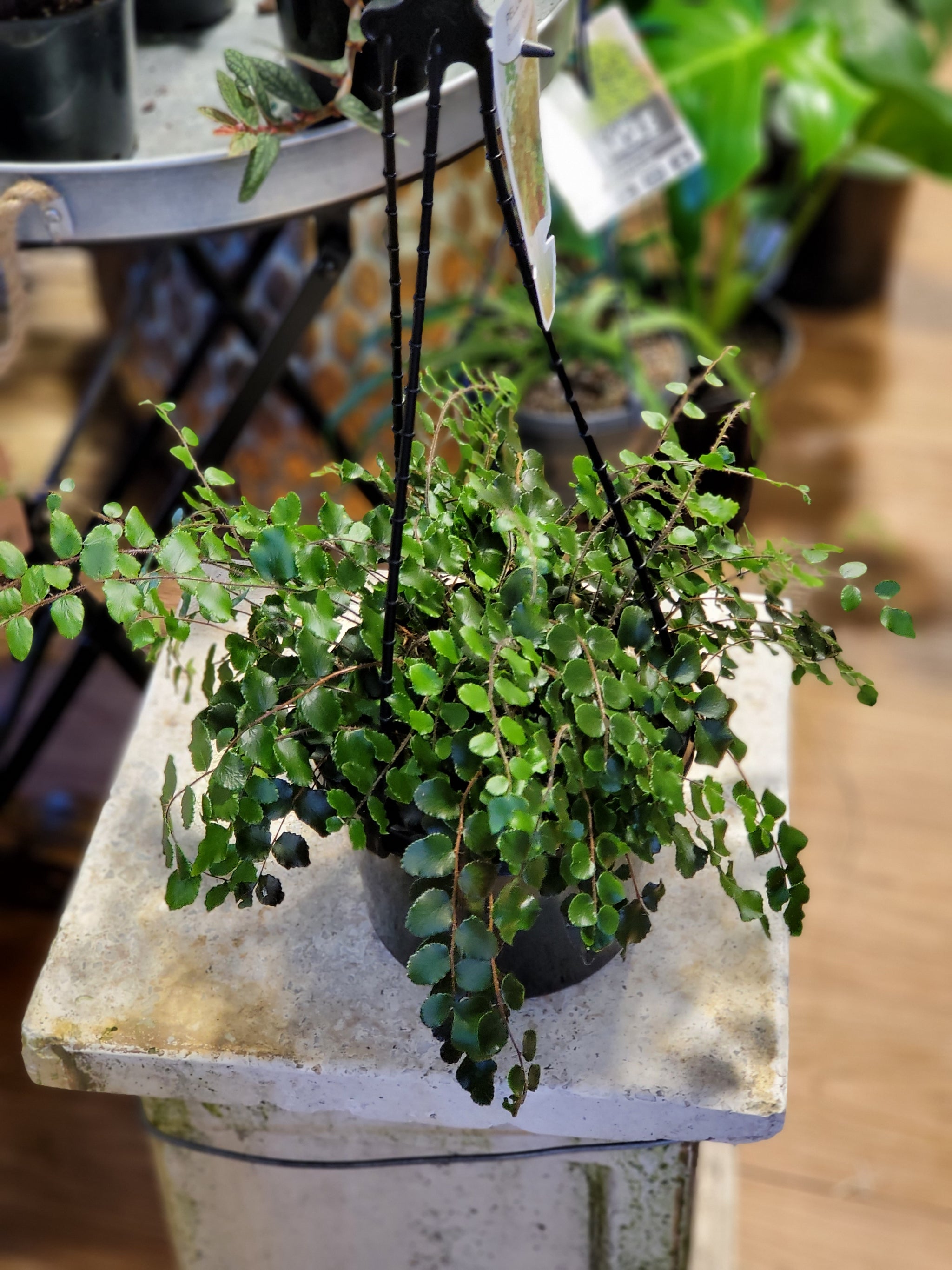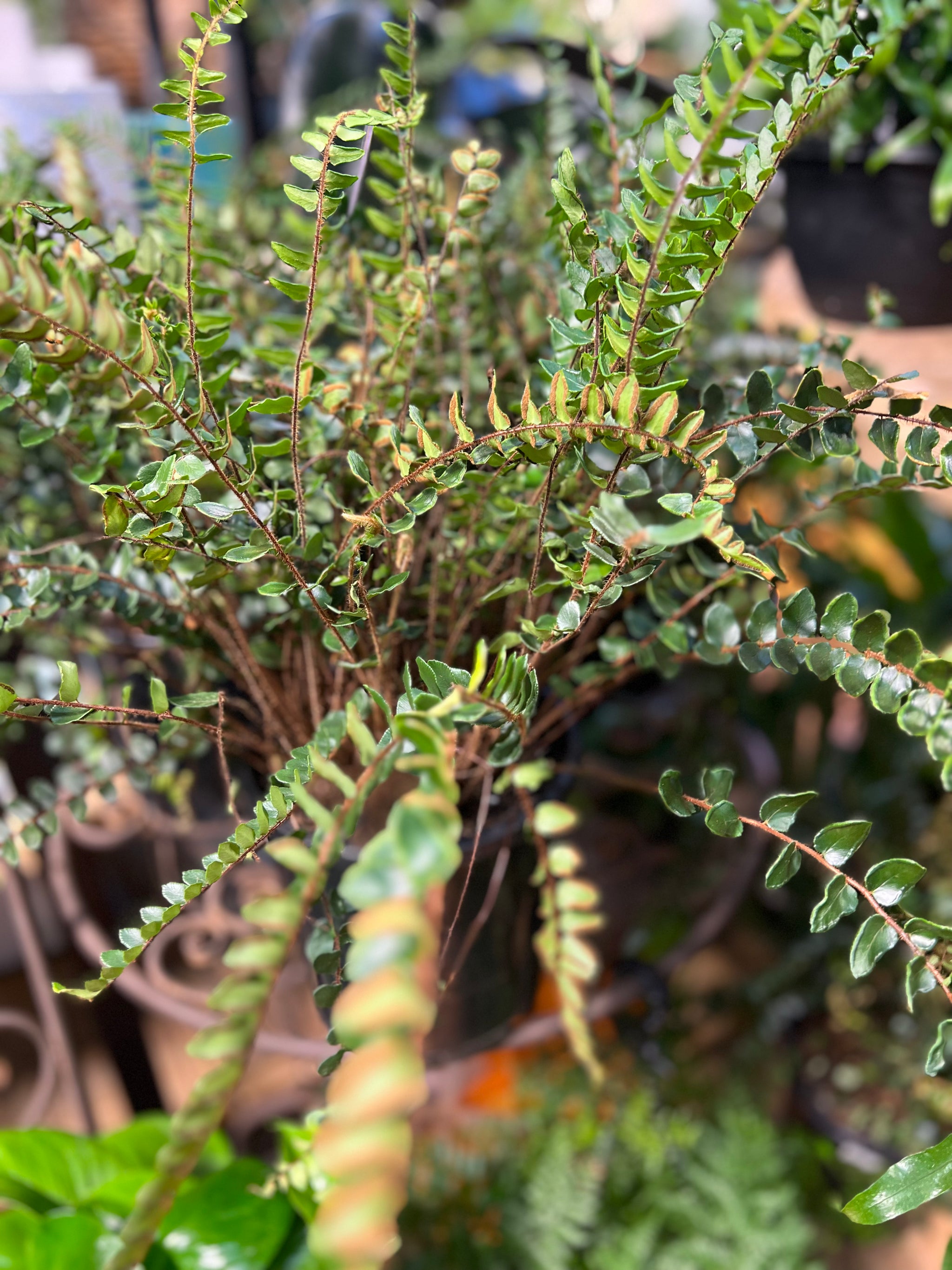 Pellaea spp Ovata and  rotundifolia, the button fern, is a species of fern endemic to New Zealand, where it grows in scrub and forests. It is also a popular garden plant and house plant, tolerating low temperatures but not freezing. They love a brightly lit room.